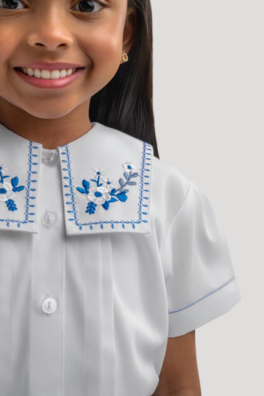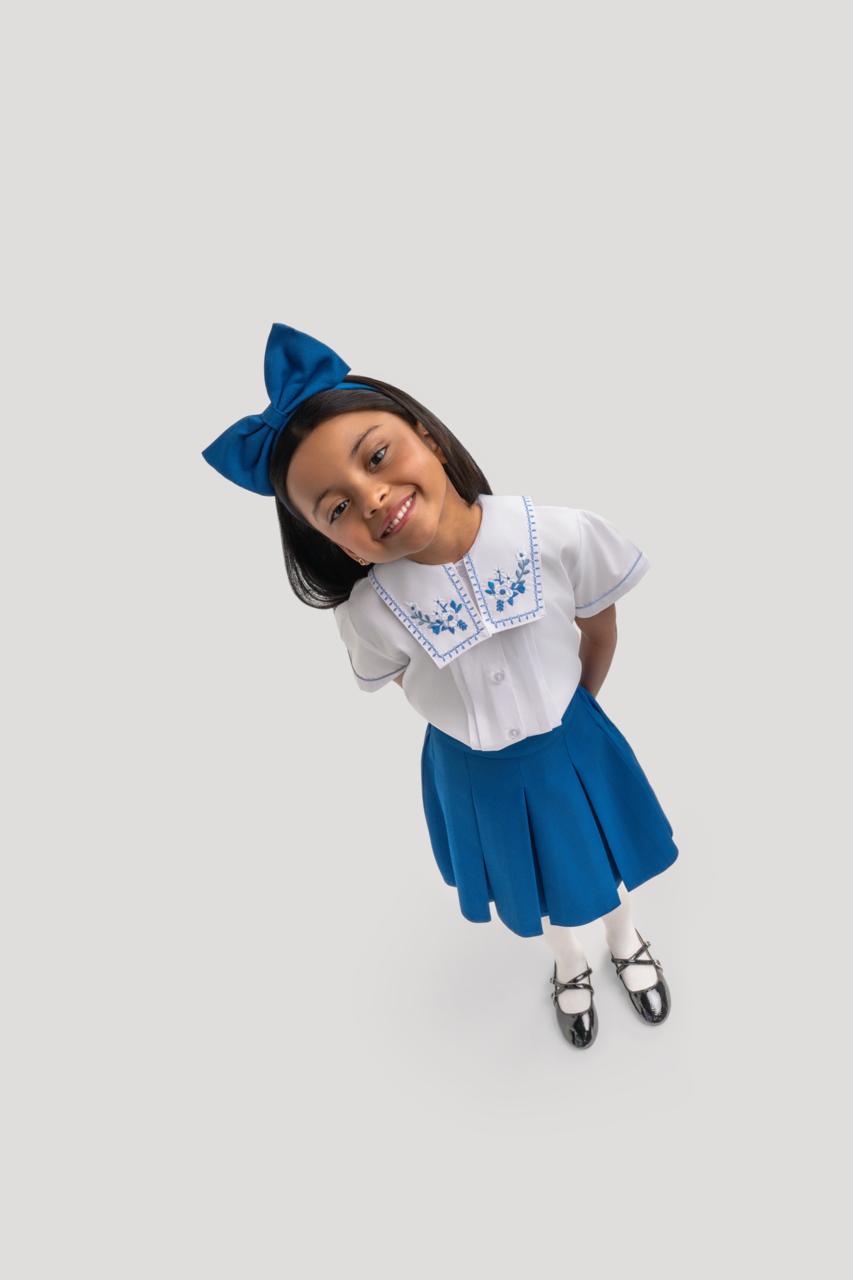 Experience classic elegance with this Kuwaiti-made kindergarten shirt and skirt set, featuring a special embroidered collar and sophisticated stitching for a refined finish.